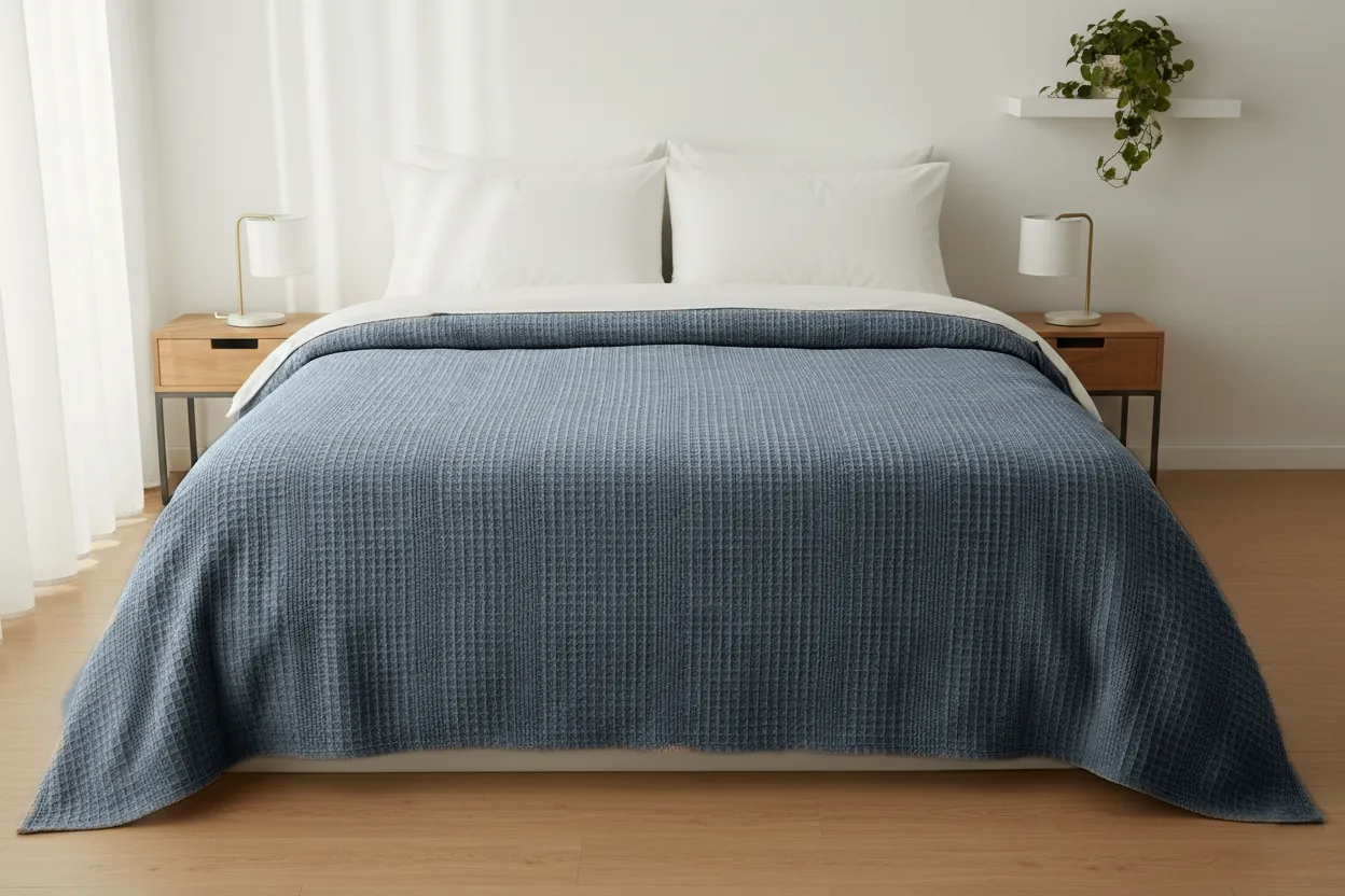 A lightweight and breathable pique blanket made from a cotton blend, designed for comfortable everyday use and elegant bedroom styling. Its soft texture and practical structure make it ideal for warmer seasons and decorative layering.